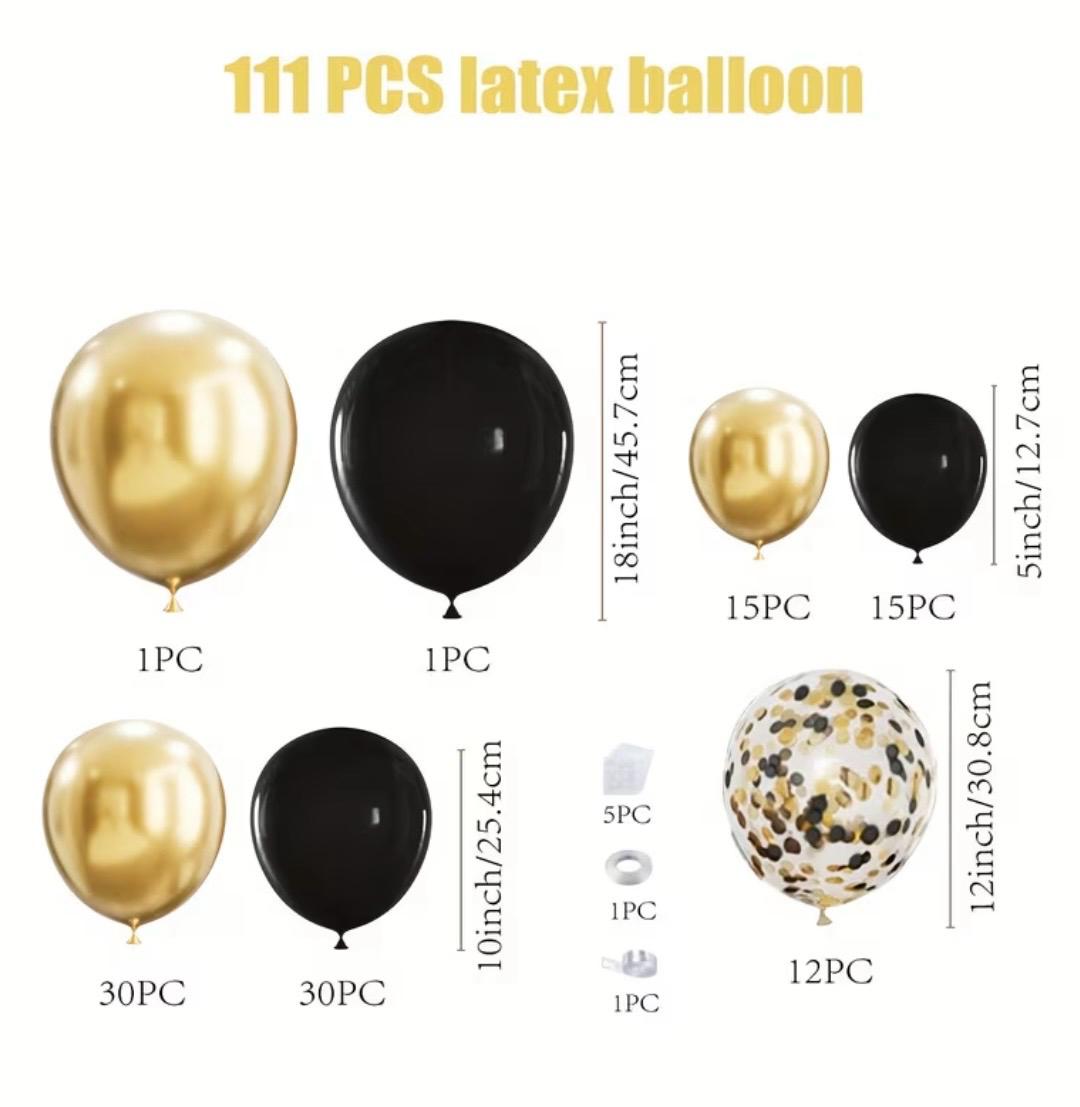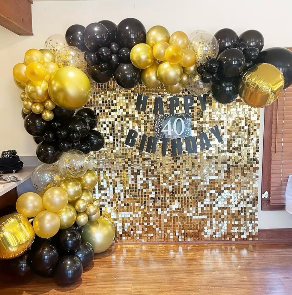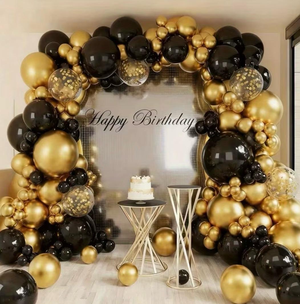 Arco decorativo de globos en tonos negro intenso y dorado metálico, diseñado para crear un ambiente sofisticado, moderno y de alto impacto visual. Ideal para cumpleaños adultos, aniversarios, fiestas de gala, eventos corporativos y celebraciones especiales.