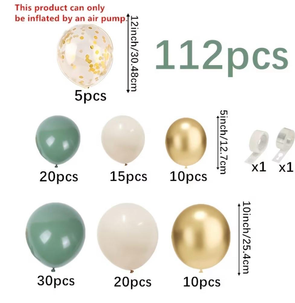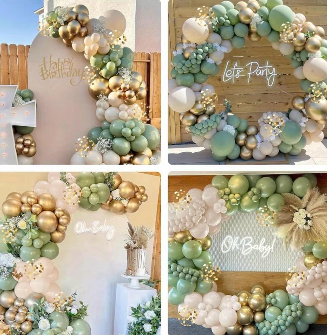 Set decorativo de arco de globos en tonos verde sage, blanco y dorado, diseñado para crear un ambiente elegante, moderno y sofisticado. Ideal para cumpleaños, baby showers, bautismos, aniversarios, eventos especiales y celebraciones en interiores.