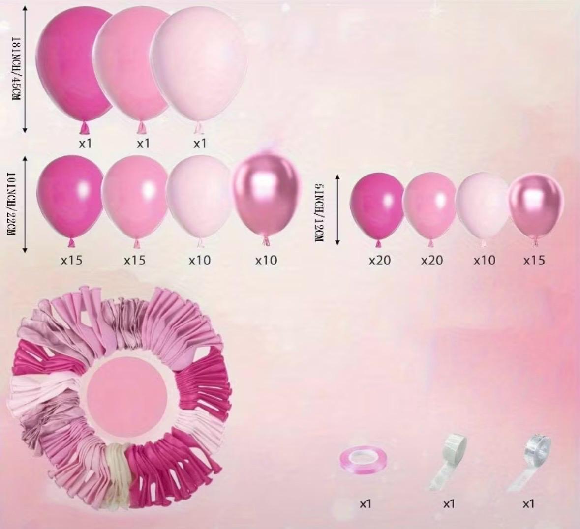 Kit completo para armar arco de globos rosado, ideal para cumpleaños, baby showers, bautismos, fiestas infantiles y celebraciones especiales. Incluye globos de distintos tamaños y tonos rosados que permiten lograr un efecto orgánico, elegante y profesional, incluso sin experiencia previa.