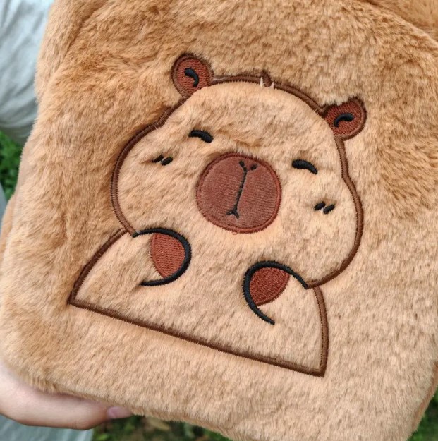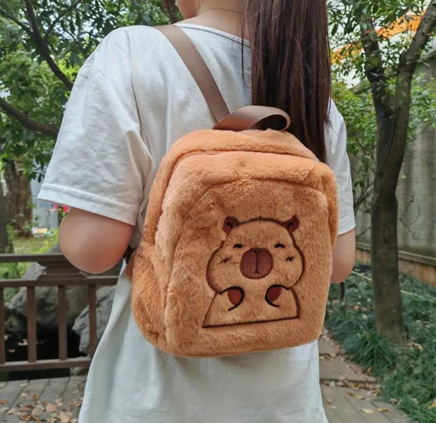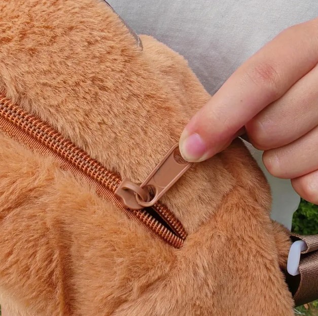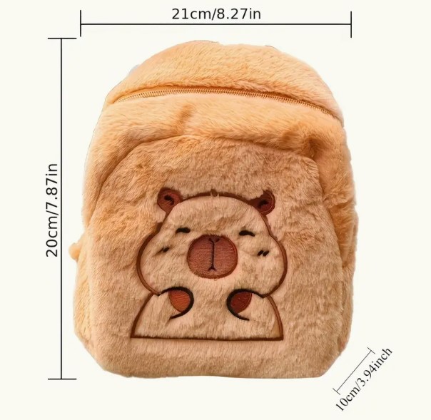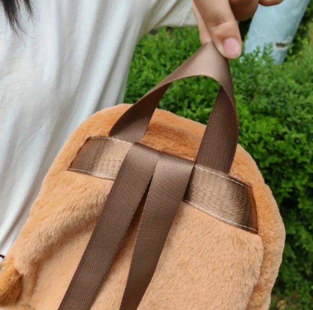Mochila peluche sintético suave, beige con detalles marrones, correas ajustables.